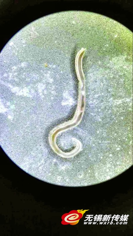 記者來到江蘇省寄生蟲防治研究所采訪專家時,蠕蟲室的醫(yī)生沈明學(xué)正用顯微鏡觀察一條異尖線蟲(如圖)。他說,這種異尖線蟲就是深海魚類身上最常見的寄生蟲,會寄生在海魚的肌肉和腹腔中。記者看到,這條蟲子長一厘米多,呈白色,兩頭尖尖的。專家解釋這并不是它本來的顏色,原先是淡淡的肉色,經(jīng)過處理后才變成白色。