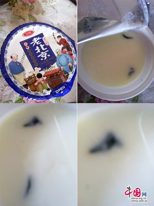 7月7日,記者接到消費(fèi)者林女士的投訴,當(dāng)天早晨,她揭開(kāi)一盒三元老北京酸奶封皮時(shí),發(fā)現(xiàn)了兩個(gè)黑綠色的異物,用勺碰碰感覺(jué)還有一定的硬度,看了作嘔。該盒酸奶是林女士于6月17日左右,在北京首航超市37店(育龍店)購(gòu)買(mǎi),當(dāng)時(shí)她一共買(mǎi)了十盒。同批買(mǎi)的其他9盒都沒(méi)有問(wèn)題,只有這一盒出現(xiàn)了黑綠色的異物。