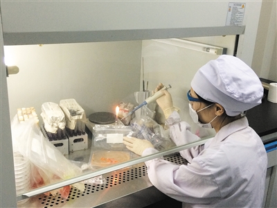 實驗人員正在無菌環(huán)境下制作水果樣品勻液