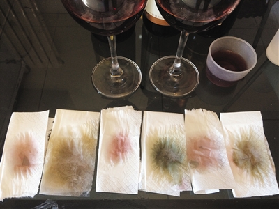 果真很多紅酒都是假的嗎?這種檢測方法靠譜嗎?昨日,新京報記者通過超市、小商店、綜合市場等途徑購買了3種紅葡萄酒樣品,價格從13元到45元不等。實(shí)驗(yàn)中,三種紅葡萄酒樣品分別取3滴,滴至餐巾紙上,再分別加堿水,觀察顏色變化。