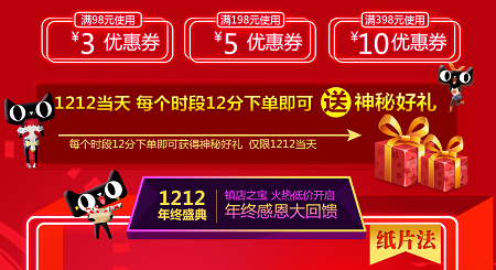 你還在為“雙11”沒享受到優(yōu)惠而惋惜么?那么現(xiàn)在補救的機(jī)會來了,2015年最后一波,天貓ZYD旗艦店“雙12 ”讓我們再嗨這一次,把“雙11”沒搶到的補回來。為了感謝新老客戶對我們店鋪長久以來的支持,在雙12活動期間,我們推出了以下活動,感恩回饋各位: