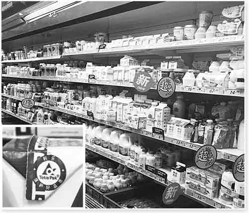 右上圖 利樂包裝讓高溫消毒的無菌奶占據(jù)壓倒性優(yōu)勢(shì),需要冷藏保存的低溫巴氏殺菌奶受到影響。而業(yè)界公認(rèn),低溫奶營養(yǎng)價(jià)值更高,跟常溫奶占據(jù)的空間和熱鬧的促銷形成鮮明對(duì)比,品種很少。這是超市里的低溫奶專柜。經(jīng)濟(jì)日?qǐng)?bào)記者 佘 穎攝