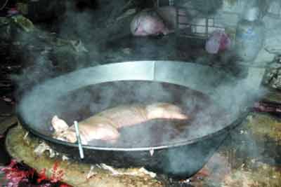 在查獲現(xiàn)場,記者看到違法人員臨時搭建的私宰帳篷里,地上鋪滿了豬血和豬毛的混合物,生豬糞便隨著水流漸漸形成一條“小河”流向遠(yuǎn)處,殺豬刀、鐵鉤、鐵叉等用于私宰的工具隨意擺放在地上,與豬毛、豬血、糞便等混合在一起,現(xiàn)場一口直徑近2米的大鍋盛滿了水,熱氣騰騰。深圳市市場稽查局食品稽查處的執(zhí)法人員告訴記者,這口大鍋是用來給生豬褪毛的,隨后就在骯臟的環(huán)境下進(jìn)行屠宰和分割、裝填貨車,這樣的豬肉其質(zhì)量可想而知。