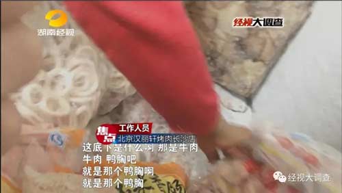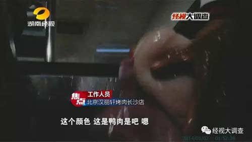 北京漢麗軒烤肉店遍布全國(guó),可是在長(zhǎng)沙這家店我們憤怒的看到,店里的所謂牛肉都是用鴨肉偽造,甚至還摻入變質(zhì)的鴨肉,而且造假用的鴨肉都是統(tǒng)一配送過來的。若不是記者長(zhǎng)時(shí)間辛苦的臥底調(diào)查,誰(shuí)能知道其中真相!消費(fèi)者會(huì)永遠(yuǎn)被蒙蔽,欺詐伎倆會(huì)永遠(yuǎn)繼續(xù),漢麗軒會(huì)繼續(xù)“騙過全世界”。誠(chéng)信不僅是經(jīng)商的根本,更是做人的根本,對(duì)于這種弄虛作假的所謂全國(guó)連鎖,消費(fèi)者不歡迎!我們期待執(zhí)法部門重拳出擊,而不是為之遮丑掩蓋。