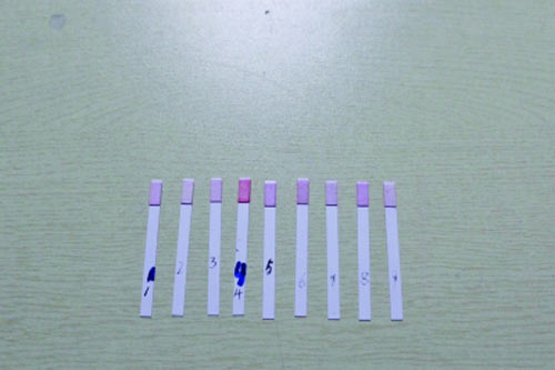 9種樣品取樣檢測后,檢測試紙顏色基本未變,也未呈現(xiàn)藍(lán)紫色。