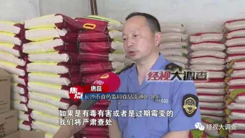 執法人員發現,在這些過期問題大米周邊都存在著一種粉末狀的藥物。趕來的老板這樣解釋:“就是對這些米質量要求不那么嚴格的了,我會對他說這個米是怎么樣的,這些米的質量肯定不如正常的?!?