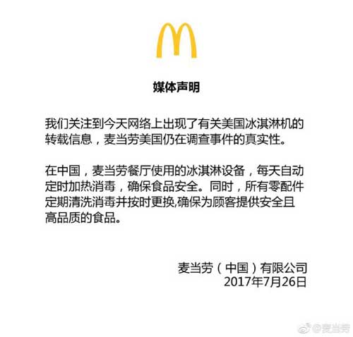 7月26日23時許,麥當勞官方微博發(fā)布了《關于美國冰淇淋機的媒體聲明》:“我們關注到今天網(wǎng)絡上出現(xiàn)了有關美國冰淇淋機的轉(zhuǎn)載信息,麥當勞美國仍在調(diào)查事件的真實性。在中國,麥當勞餐廳使用的冰淇淋設備,每天自動定時加熱消毒,確保食品安全。同時,所有零配件定期清洗消毒并按時更換,確保為顧客提供安全且高品質(zhì)的食品。”