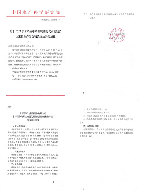 中國水產科學研究院質量與標準研究中心受農業部漁業漁政管理局委托 ,運用智云達自主研發的水產品快檢產品,對水產品中硝基呋喃類代謝物進行快速檢測。2017年10月23日-24日,該檢測在國家水產品質檢中心順利開展。驗證結果如下: