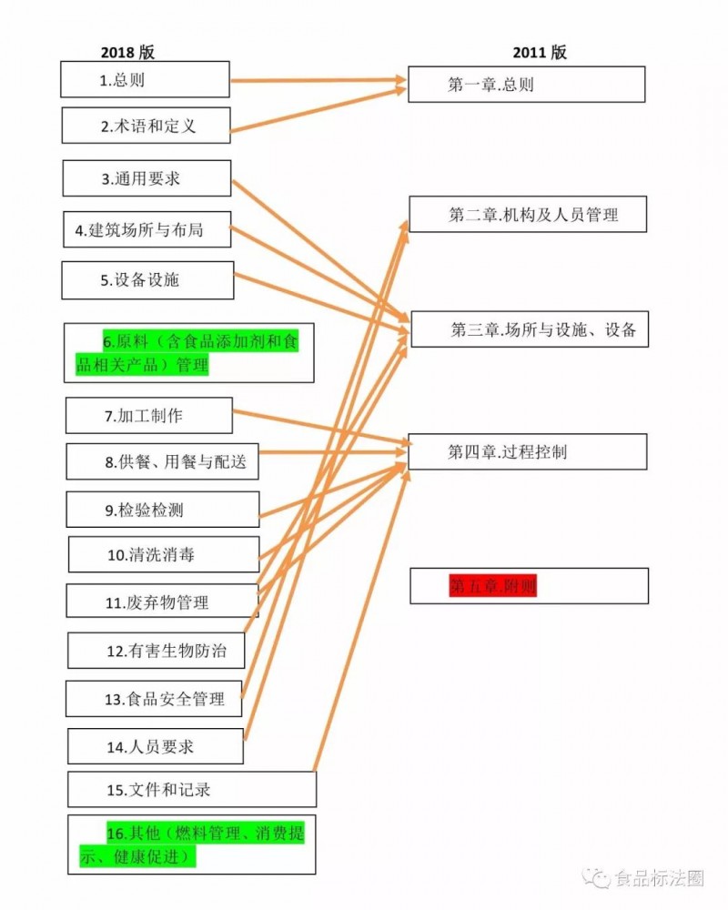 2018版《餐飲服務食品安全操作規范》分成了16個部分,分別是:1.總則、2.術語和定義、3.通用要求、4.建筑場所與布局、5.設備設施、6.原料(含食品添加劑和食品相關產品)管理、7.加工制作、8.供餐、用餐與配送、9.檢驗檢測、10.清洗消毒、11.廢棄物管理、12.有害生物防治、13.食品安全管理、14.人員要求、15.文件和記錄、16.其他(燃料管理、消費提示、健康促進)。