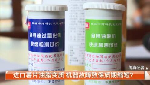 記者找到了專業的檢測人員,對薯片里的油進行酸價和過氧化值的檢測。經檢測,這款薯片里油脂的酸價和過氧化值均超過了正常范圍,證明薯片使用的植物油已經酸敗。
