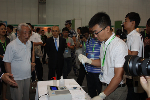 當鄒家華首長來到展會的現場操作區時,智云達食品安全檢測工程師于勇的實驗吸引領導駐足觀看,隨后鄒家華首長對現場進行的農藥殘留實驗進行了詳細的詢問,了解了食品快檢的工作原理及作用,提出了相關問題,并對目前的工作做出了指導。