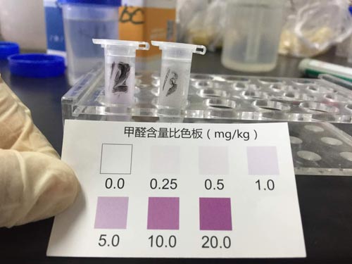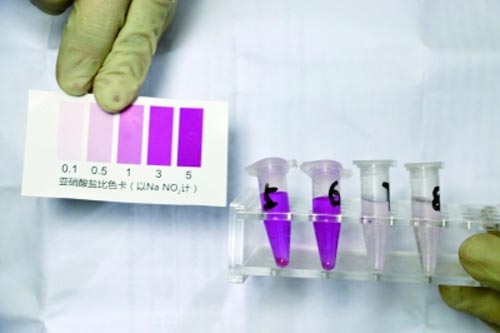 11個(gè)樣品檢測液顏色均有變化,均檢出亞硝酸鹽成分。其中5號、6號呈現(xiàn)紫紅色,亞硝酸鹽含量最高,45mg/kg,高于預(yù)包裝熟食不得超過30mg/kg的國家限量標(biāo)準(zhǔn)。