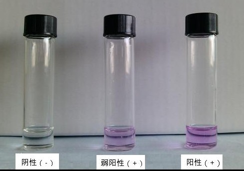 若溶液出現(xiàn)粉紅至紫紅色,則判為陽(yáng)性(+);否則判為陰性(-);(有時(shí)溶液濃度較低,褪色較快,請(qǐng)?jiān)诘渭訕悠诽幚硪簳r(shí)注意觀察)。