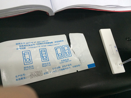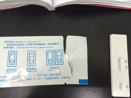 1、  從包裝袋中取出試紙卡,打開后平放在桌面上,用吸管吸取待檢樣品溶液,滴加 3 滴于加樣孔中,加樣后開始計時