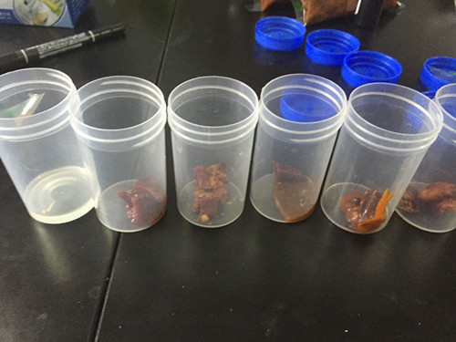 我們隨機(jī)取一點(diǎn)火鍋底料,放入干凈的容器中,加入5ml蒸餾水進(jìn)行溶解,發(fā)現(xiàn)有幾種由于含油量較高,凝結(jié)成塊,無法很快溶解,因此我們對(duì)其稍微加熱,使得完全溶解。完全溶解后即得到我們的火鍋樣品。