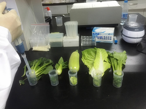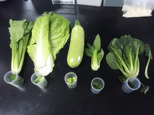 然后對所有蔬菜進行取樣,各取2g表皮或者外層葉子(這些往往是噴灑農藥接觸較多的地方);