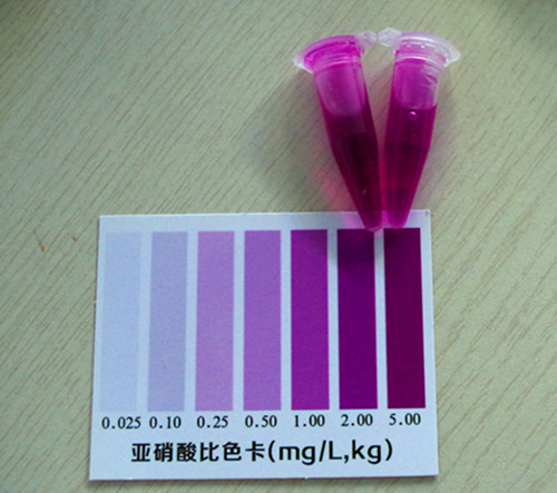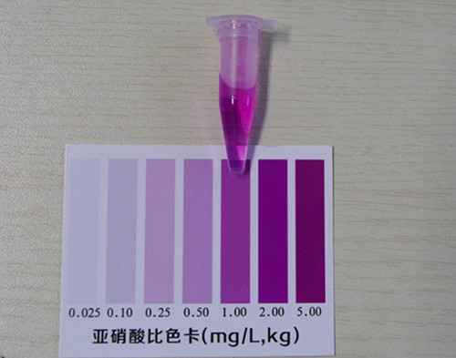 加入2滴試劑2搖勻靜置10分鐘后與標(biāo)準(zhǔn)比色卡對(duì)比,該比色卡上的數(shù)值乘上10即為樣品中亞硝酸鹽的含量mg/kg(以NaNO2計(jì))。