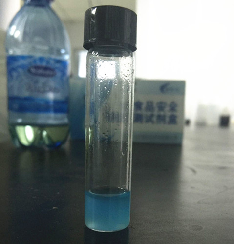 結果判斷:如溶液顯淺黃色,說明油樣酸價≥8mgKOH/g,酸價指標為陽性;溶液顯藍色、淺藍色或綠色,酸價指標為陰性。溶液出現(xiàn)混濁,水分指標為陽性;溶液澄清透明,水分指標為陰性。