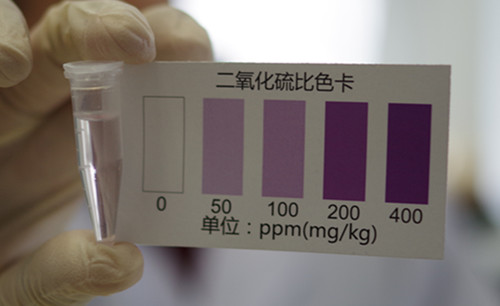 放置5分鐘觀察顏色變化,并與色卡對照,得出樣品中二氧化硫并未達到50 mg/kg,因此判斷二氧化硫含量未超標。