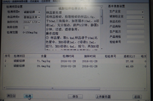 將裝有空白液和樣品液的比色皿分別放入儀器中,檢出樣品中均含有鋁,國標(biāo)中規(guī)定,鋁允許在粉絲、粉條中作為添加劑使用,殘留量小于等于200 mg/kg。