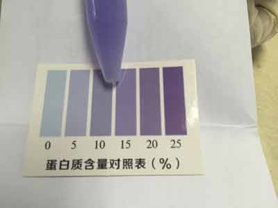 取4 mL顯色液加入比色管中,蓋上蓋,用力將奶粉全部搖溶,顯色3分鐘,在3~5分鐘內(nèi)將比色管襯在白紙上與標(biāo)準(zhǔn)比色卡進行對比,找出與乳粉蛋白質(zhì)標(biāo)準(zhǔn)比色卡上相近的色階,即為每100g乳粉樣品中蛋白質(zhì)的含量。
